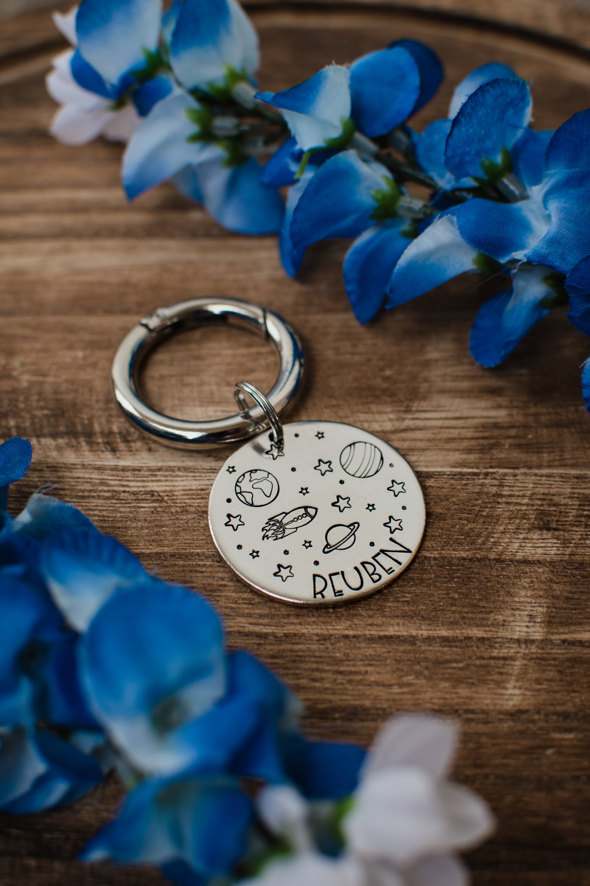 Due to the fact that our tags are hand stamped and made to order, there will be slight variations between tags. Each stamp is a set size so the design will look slightly different depending on the size of tag you choose. All tags will come with a small 1/2” and a large 1” split keyring. Carabiners and extra keyrings can be purchased in the ‘Add Ons’ tab.